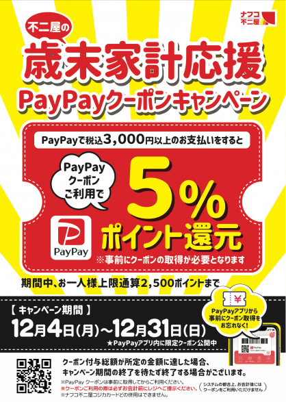 不二屋の歳末家計応援PayPayクーポンキャンペーン 期間12月4日(火)〜12月31日(日) 事前にPayPayクーポンを取得して頂き PayPayで税込3000円以上のお支払いで5%PayPayポイント還元となります。是非この機会にお得なクーポンキャンペーンご利用ください