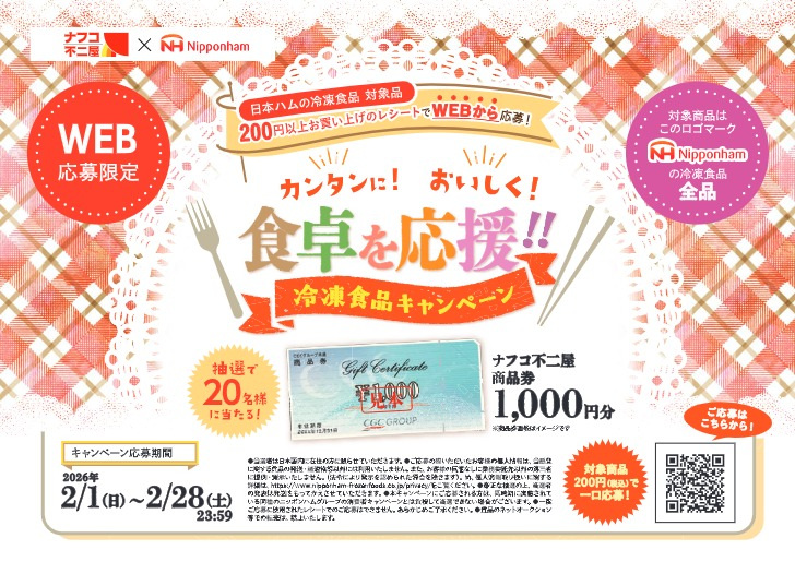 ナフコ不二屋では、日本ハム冷凍食品との協賛キャンペーンを実施いたします。
