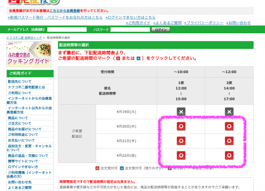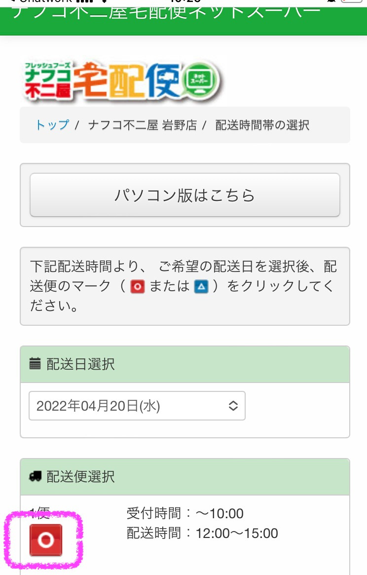 - 「ご希望の配送時間のマーク( 〇 または △ )」をタップ