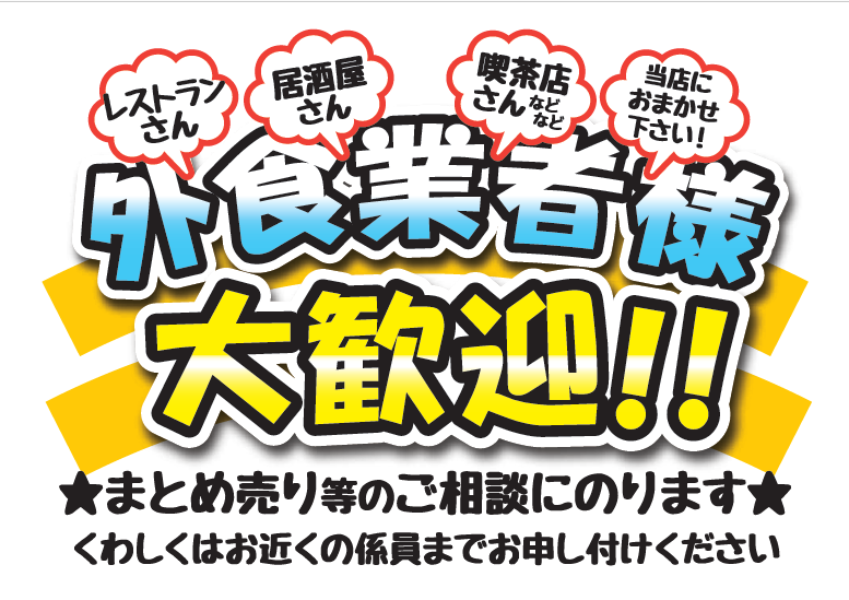 外食業者様大歓迎!! 外食業者様を大歓迎いたします。 外食産業の皆様へ。 ナフコ不二屋では、外食業者様のお手伝いをさせていただきます。 ご希望の食材を必要な数量・日時に合わせてご用意いたします。 その他、ご相談も承りますので、 お近くの店舗までお問い合わせくださいませ。