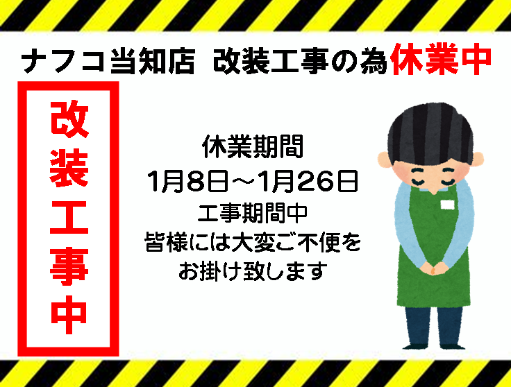 2024年01月04日(木) ナフコ当知店 改装のお知らせ ナフコ当知店(名古屋市港区)1月8日(月)から1月26日(金)(予定)まで店舗改装の為休業いたします。 皆様にはご不便をお掛け致します事をお詫び申し上げます。 1月27日(土)(予定)新しくなってリニューアルオープンいたしますのでどうぞご期待くださいませ。