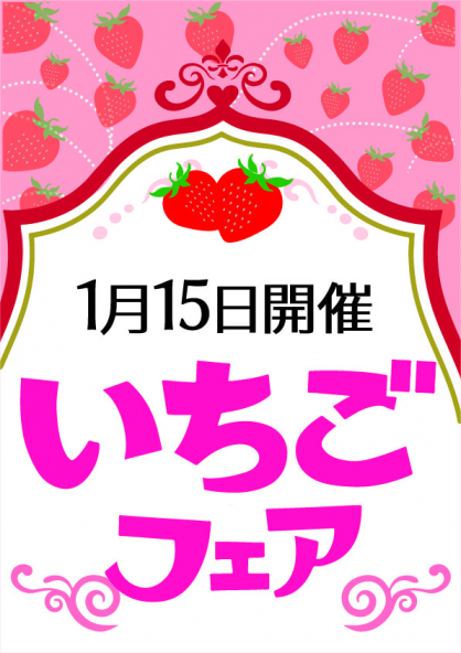 2024年01月07日(日) 1月15日(月)いちごフェア 1月15日(月)いちごフェア開催いたします 旬のいちご。果物コーナーでは各品種のいちごを取り揃えます。またでデザートコーナーではいちごデザートフェスを開催。 パンコーナーではいちごのパンまつりを開催。旬のいちご是非ご賞味ください。