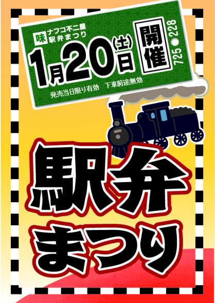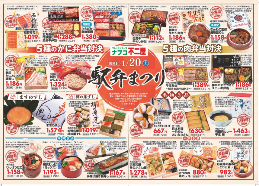 2024年01月07日(日) 1月20日(土)駅弁まつり開催 1月20日(土)駅弁まつりを開催 日本全国有名駅弁をご用意。かに弁当5種対決、肉弁当5種対決、人気のますのすし、柿の葉ずしなど。 ご家庭でちょっと旅気分味わいませんか? ※当知店・東野店では開催いたしません