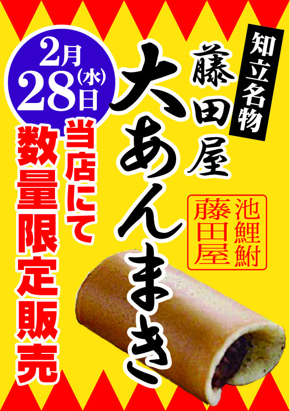 2024年02月08日(木) 2月28日(水)藤田屋 大あんまき 2月28日(水)藤田屋 大あんまき 知立名物 藤田屋 大あんまきを限定販売致します❗️ 生地はふんわり、甘さ控えめの粒あんでお茶請けに最適❗️ 当日は不二屋の日も同時開催ですよ〜