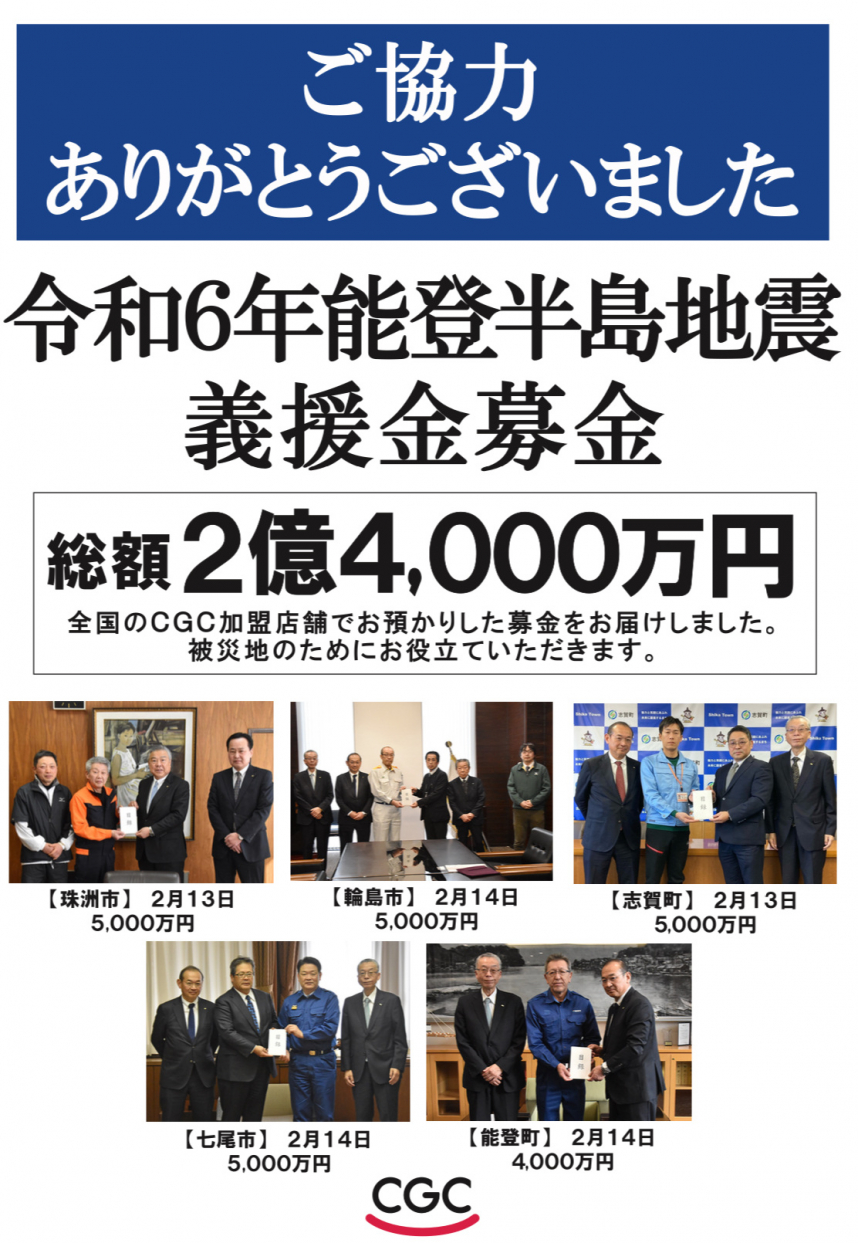 お預かりしました募金は、CGCグループ総額2億4,000万円と共に被災地の自治体を通じて被災地のためにお役立ていただきます。