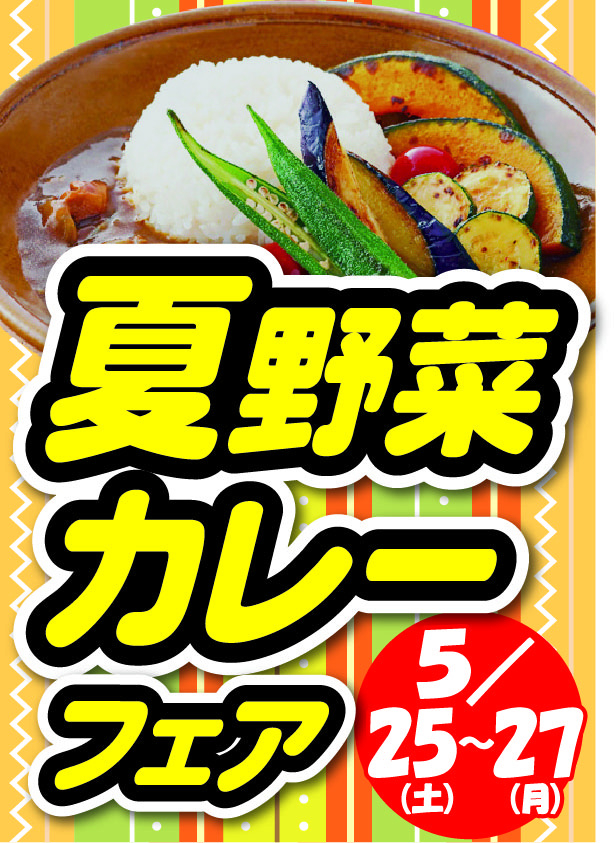 2024年05月11日(土) 5月25日(土)~5月27日(月)夏野菜カレーフェア 5月25日(土)~5月27日(月)夏野菜カレーフェア 旬の野菜を使ったカレーはいかが? トマト、なす、かぼちゃ、パプリカ、ピーマン、ズッキーニ、ししとう、オクラなど 野菜の豊富なカレー、夏バテ防止にも!