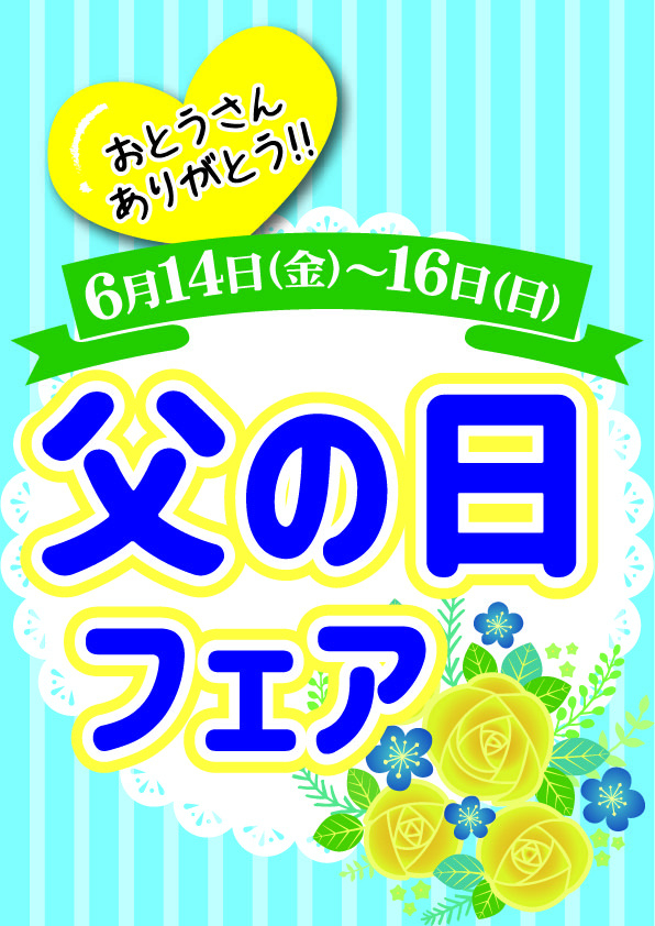 2024年05月31日(金) 6月14日(金)~16日(日)父の日フェア 6月14日(金)~16日(日)父の日フェア開催 おとうさんありがとう。 不二屋厳選のおいしいお肉、鮮度抜群お刺身盛合せ。 お寿司やオードブル。 果物、お酒などの父の日にぴったりなごちそうを 各種豊富に取り揃えております♪ 父の日はナフコ不二屋にお任せくださいね♪