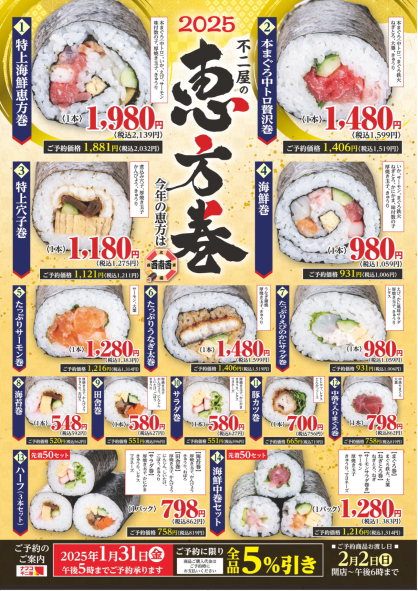 願いごとを思い浮かべながら、その年の恵方を向いて食べると福を招くとされる「恵方巻」。今年もさまざまな口福を巻き込んだ自慢の恵方巻が揃いました。 鮮度とおいしさにこだわった、不二屋の恵方巻で福いっぱいの節分をお過ごしください。ただいま、ご予約承り中です。