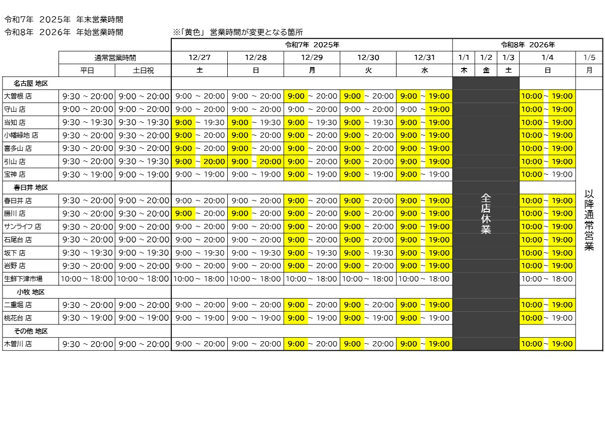 2025年11月30日(日) 2025年 年末年始営のご案内 2025年12月27日~2026年1月4日の間 営業時間変更・店休日のご案内 ※「黄色」営業時間が変更となる箇所 2026年1月5日より通常営業となります。