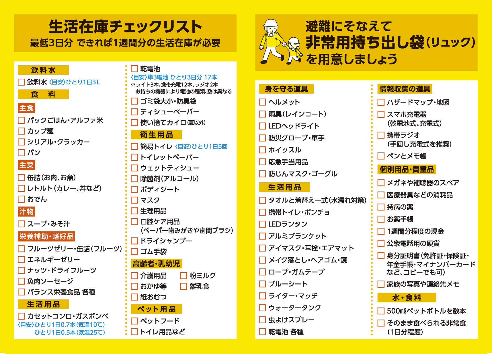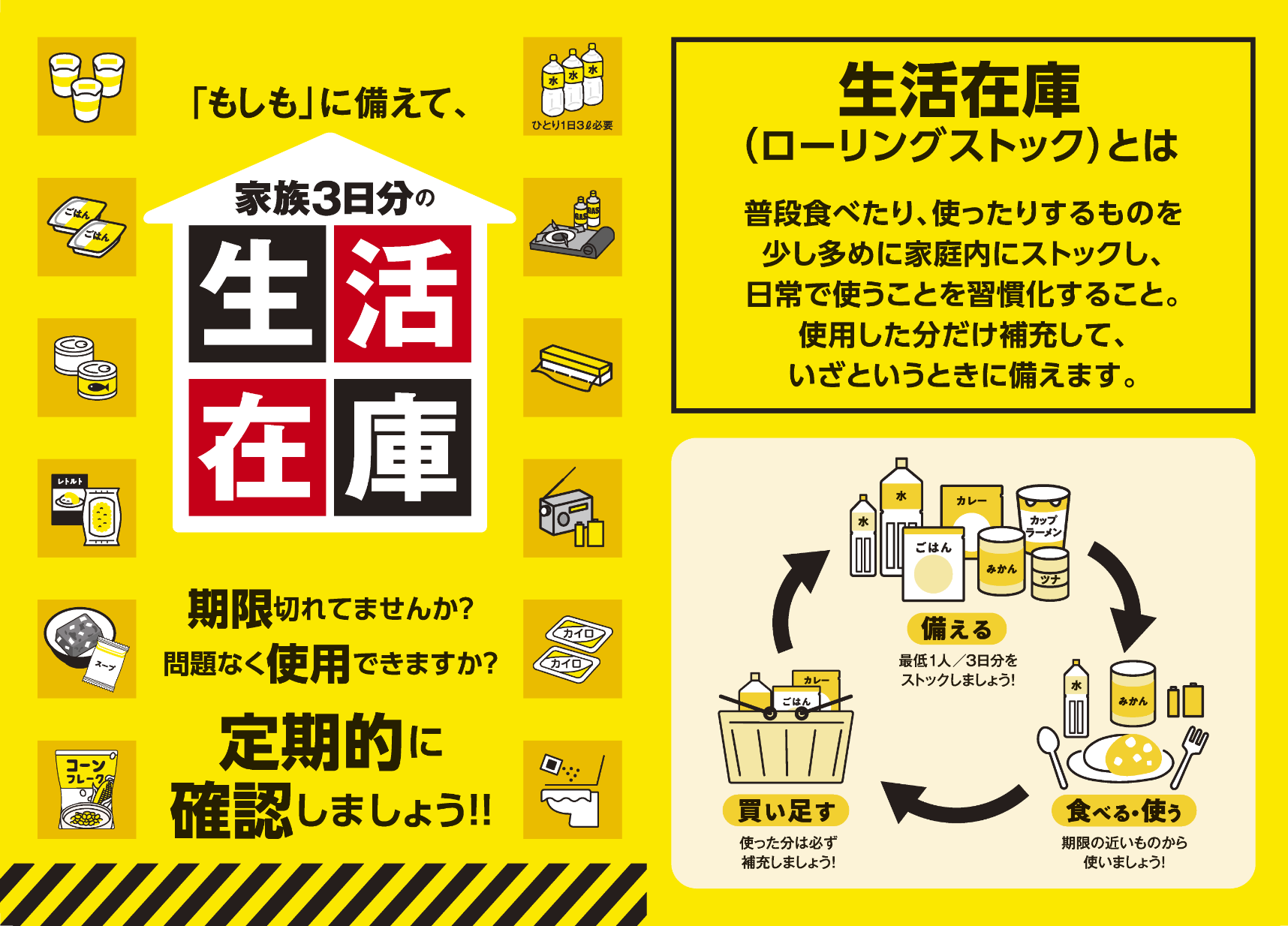 生活在庫と非常用持ち出し袋を定期的に見直し、日常に“備災”を取り入れていきましょう。